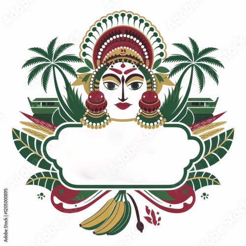 Decorative Kerala inspired artwork blending cultural heritage and festive decor. Indian blank label border frame with a paradise theme on a white background.