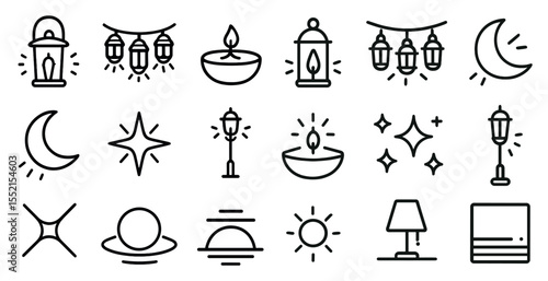 Decorative lamp silhouette icons set – lighting, moon, star symbols