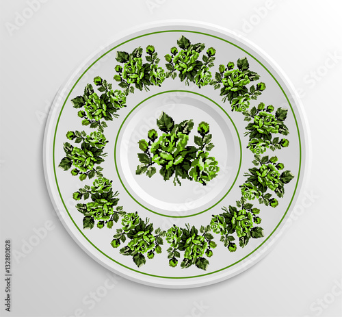 Decorative plate with round ethnic ornament. Ukrainian style. Floral rose pattern. Vintage background of napkin. Green tones.