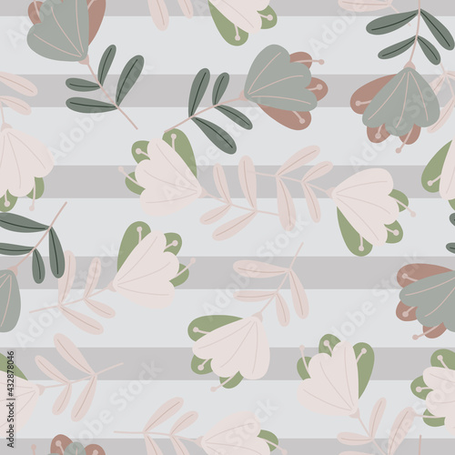 Decorative random seamless pattern with cute simple style flowers ornament. Grey striped background.