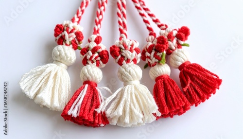 Decorative red and white tassels intertwined with braided strings, arranged with green leaves and white flowers