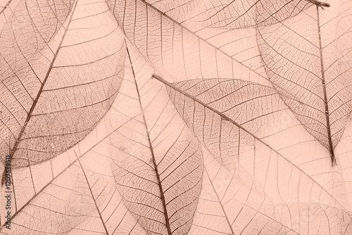 Decorative skeleton leaves, toned in mocha mousse shade. Color of 2025 year