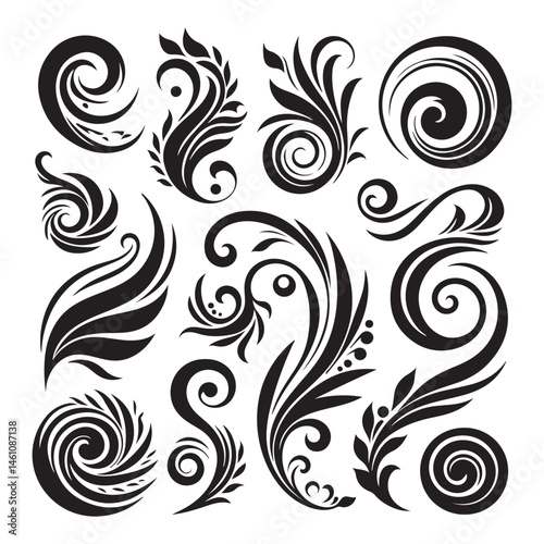 Decorative swirl and spiral vector silhouette set, perfect swirl for graphic design. Elegant shapes add a stylish touch to invitations, logos, tattoos, and art projects