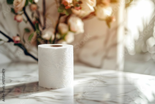Decorative toilet paper roll on marble table with floral background in soft light