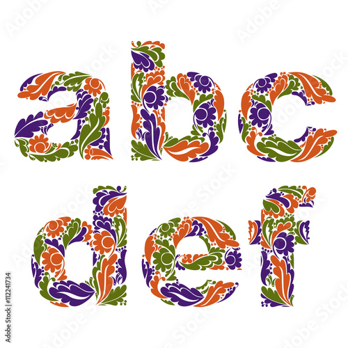 Decorative typescript with natural pattern. Flowery alphabet, ca