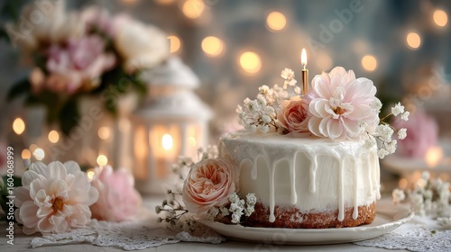 Decorative White Drip Cake with Pink Flowers and Candle in Romantic Festive Setting