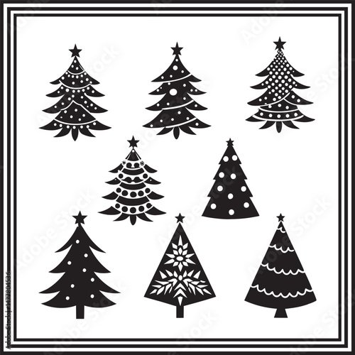 Decorative winter tree silhouette set – festive black icon collection with dotted, floral, and patterned designs