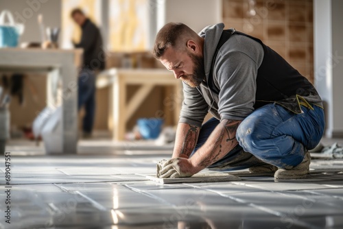 Dedicated Construction Worker Laying Ceramic Tiles in New Home