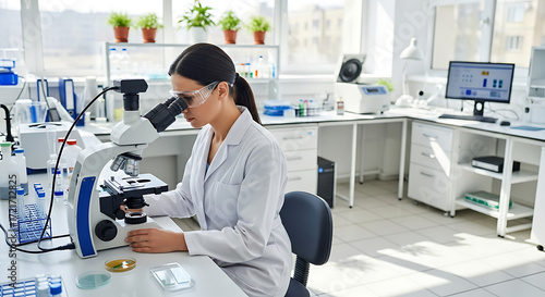 Dedicated female scientist performing intricate research and detailed analysis using an advanced optical microscope in a bright, contemporary scientific laboratory environment