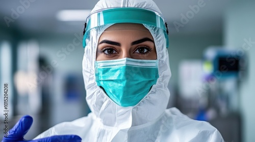 Dedicated medical professional wears a mask and protective gear, showcasing determination and focus as they prepare to care for patients in a clinical environment during a health emergency