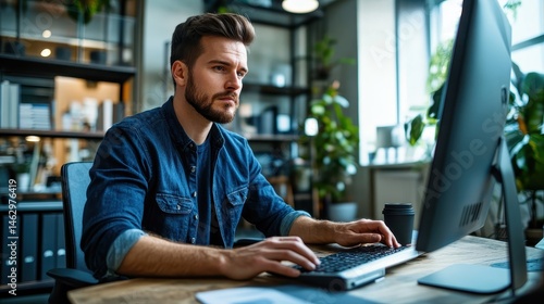 Dedicated Professional: Male Businessman Engaged in Online Project Management at Office Desk