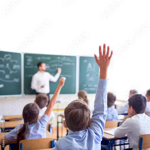 "Dedicated Teacher Writing on a Chalkboard in a Bright Classroom While a Student Raises Hand to Answer, Sunlight Highlighting Their Focused Expressions"