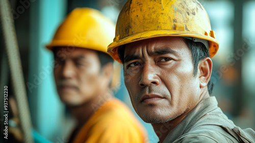 Dedicated workers in yellow hard hats focus on their tasks during a bustling construction project, showcasing persistence and teamwork