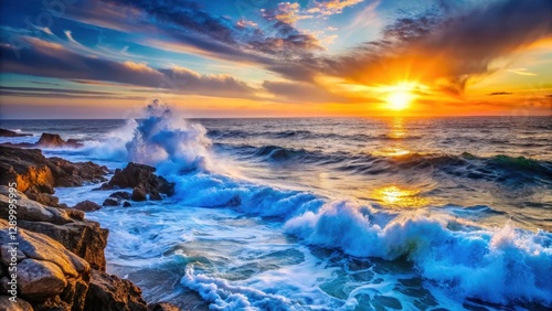 Deep blue ocean waves crashing against a rocky shoreline at sunset, rocky shore, outdoors, rocky shore, outdoors, nature, sunset