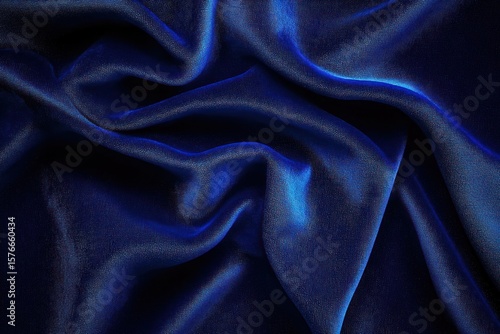 Deep blue silk fabric with smooth, glossy texture and flowing, curving folds creating an elegant and luxurious appearance