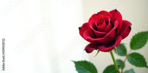 Deep crimson rose, vibrant green foliage, stark white backdrop, image, leaves
