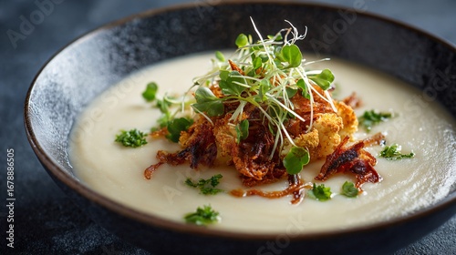 Deep focus on creamy cauliflower soup, topped with fried shallots and microgreens, moody background and off-center placement for copy space