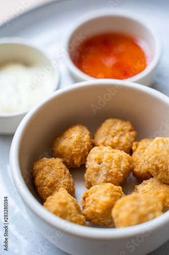 deep fried chicken nuggets with spicy sauce
