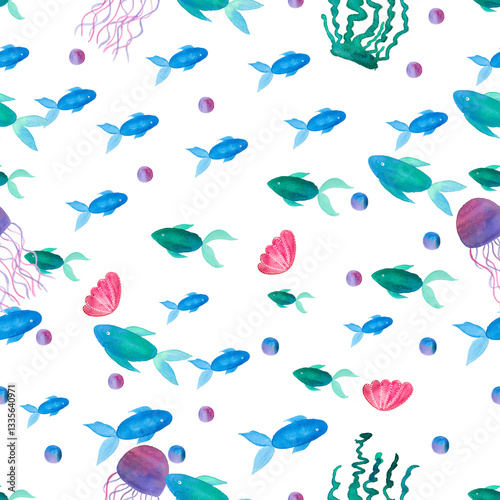 Deep Sea Seamless Watercolor Pattern Transparent Background