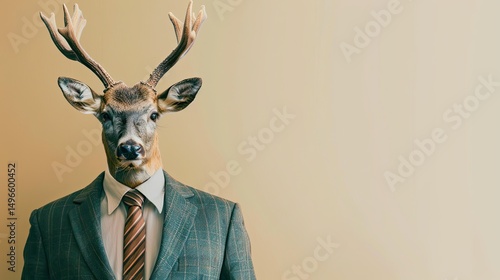 Deer in clothes. Business man in suit with tie with deer head on a solid color background in vintage style.