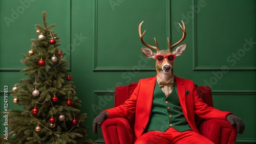 Deer in Red Suit by Christmas Tree Studio Portrait, Festive Concept, Green Background Christmas, Deer Head Swap