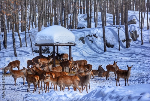 deer in snow, winter in Parc Omega, Quebec, Canada