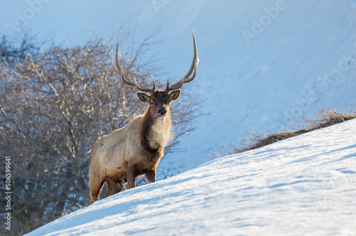 Deer in the snow against the sky and mountains. A herd of wild deer.