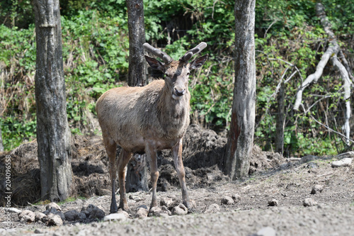 deer stag with growing antler grazing close-up