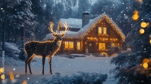 Deer Standing in Front of a Cabin With Christmas Lights in a Snowy Forest Creating a Peaceful and Festive Winter Scene