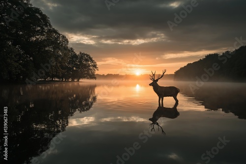 Deer standing in lake at sunrise