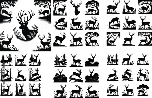 Deer with Antlers in Forest Silhouette – Wildlife Icon Set Majestic Deer in Woods Silhouette – Nature Animal Icon