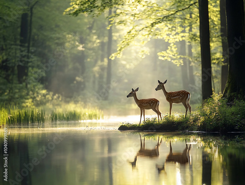 Deers in the forest. Deer in a green forest with a lake.