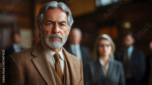 defendant standing in a courtroom, wearing a suit, looking tense, surrounded by lawyers and a judge, the atmosphere serious and intense