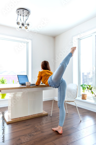 Defocus. Young business woman engaged in fitness after working on the Internet using a computer.