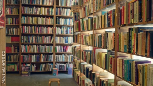 Defocused library scene with shelves full of colorful books creating a bokeh effect in an indoor environment showcasing literature and education.