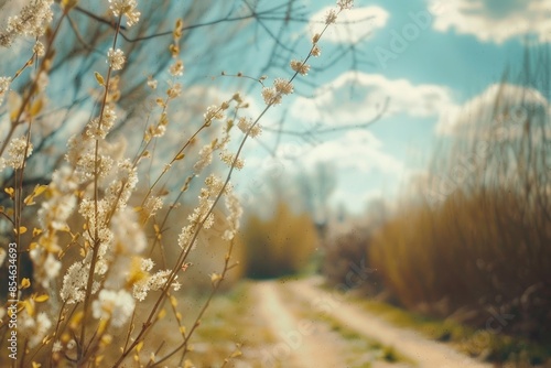 Defocused spring landscape. Beautiful nature with flowering willow branches and forest road against blue sky with clouds, soft focus. Ultra wide format.