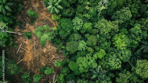 Deforest environmental problem, aerial split image from above top view, logging of rain forest, created with Generative AI