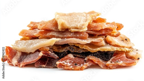 Dehydrated slices of chicken beef and pork seasoned with salt ideal for snacking displayed on a white background