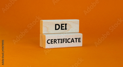 DEI diversity equity inclusion certificate symbol. Blocks with words DEI certificate on beautiful orange background. Business DEI diversity equity inclusion certificate concept. Copy space.