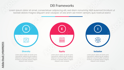 DEI frameworks infographic concept for slide presentation with big outline circle and half header with 3 point list with flat style