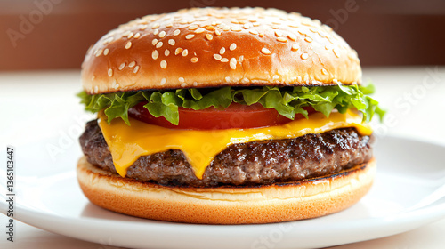 Delectable Burger: A mouthwatering hamburger, artfully presented on a pristine plate, showcases a juicy patty, fresh vegetables, and melted cheese, all nestled within a sesame-seed bun.
