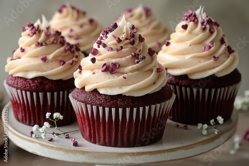 Delectable cupcakes topped with creamy frosting and heart-shaped sprinkles are perfect for a sweet treat or Valentine's Day celebration