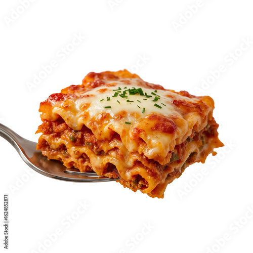 Delectable slice of cheesy lasagna, meticulously arranged, showcasing layers, isolated for various