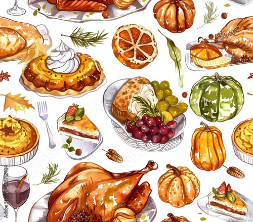 Delectable Thanksgiving Feast with Roasted Turkey Homemade Pies and Abundant Autumn Produce in Warm Watercolor