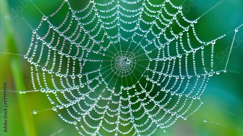 Delicate and Intricate Spiderweb Adorned with Tiny Dewdrops Glistening in the Morning
