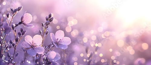 Delicate Blooms with Dew Drops in a Soft Purple Background