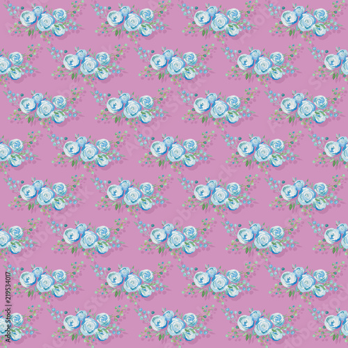 delicate blue roses seamless pattern, bouquet of flowers on a pink background, watercolor illustration. Textile design for printing on fabric, wallpaper, Country style, Gzhel