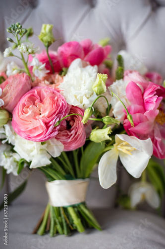 delicate bridal bouquet of pink and white flowers, flower close-up, selective focus, bouquet is on light gray armchair