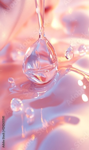 Delicate cascading droplets on a serene pink surface, abstract liquid art and soft pastel palette