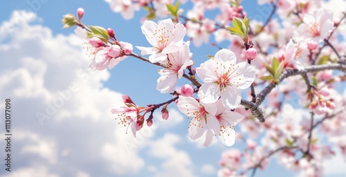 Delicate Cherry Blossom Branch Against a Blue Sky and Soft White Clouds